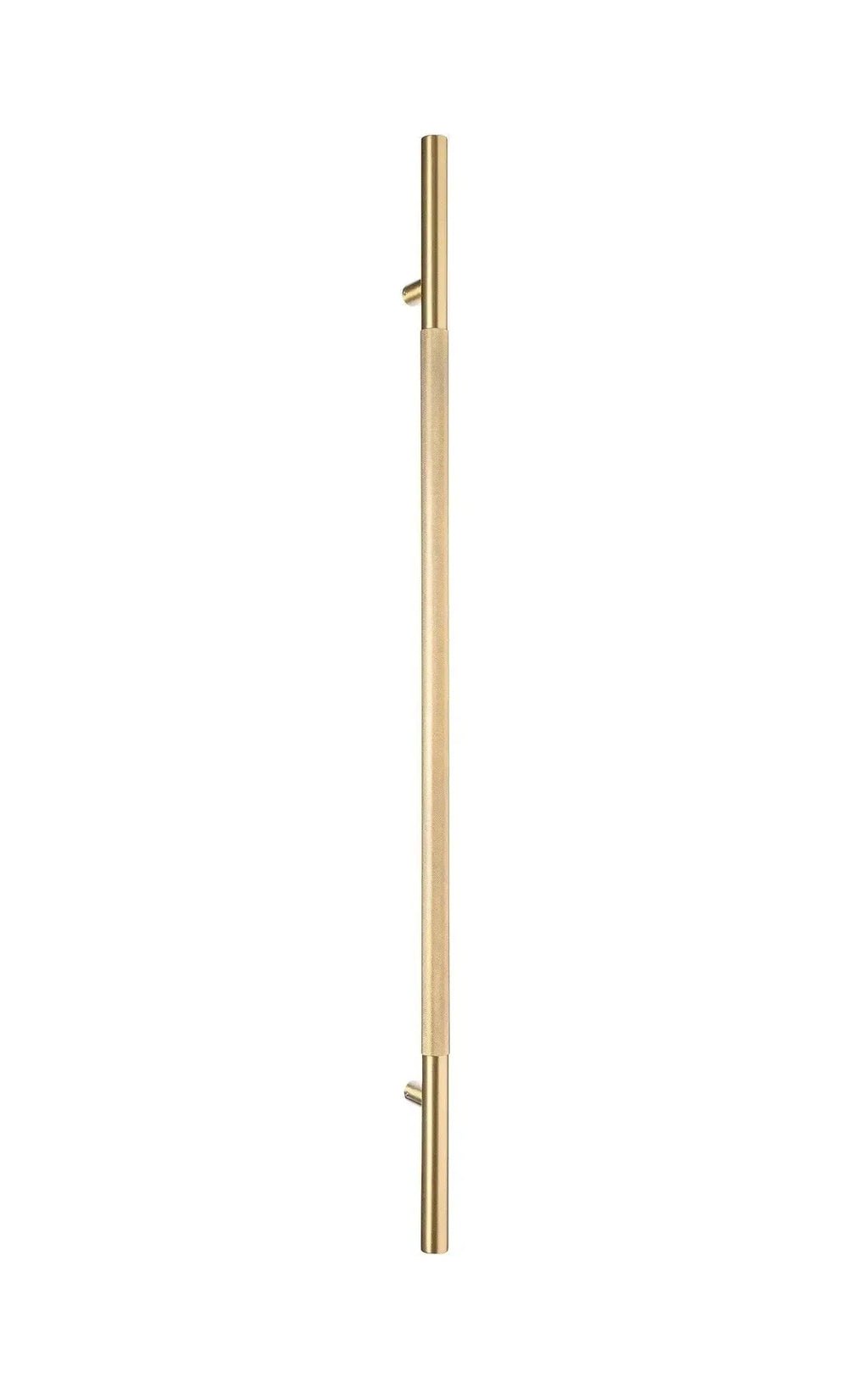 Featuring a substantial length and finely knurled texture for a distinctive, tactile look, this pull adds both functionality and modern edge to entryways or interior statement pieces.