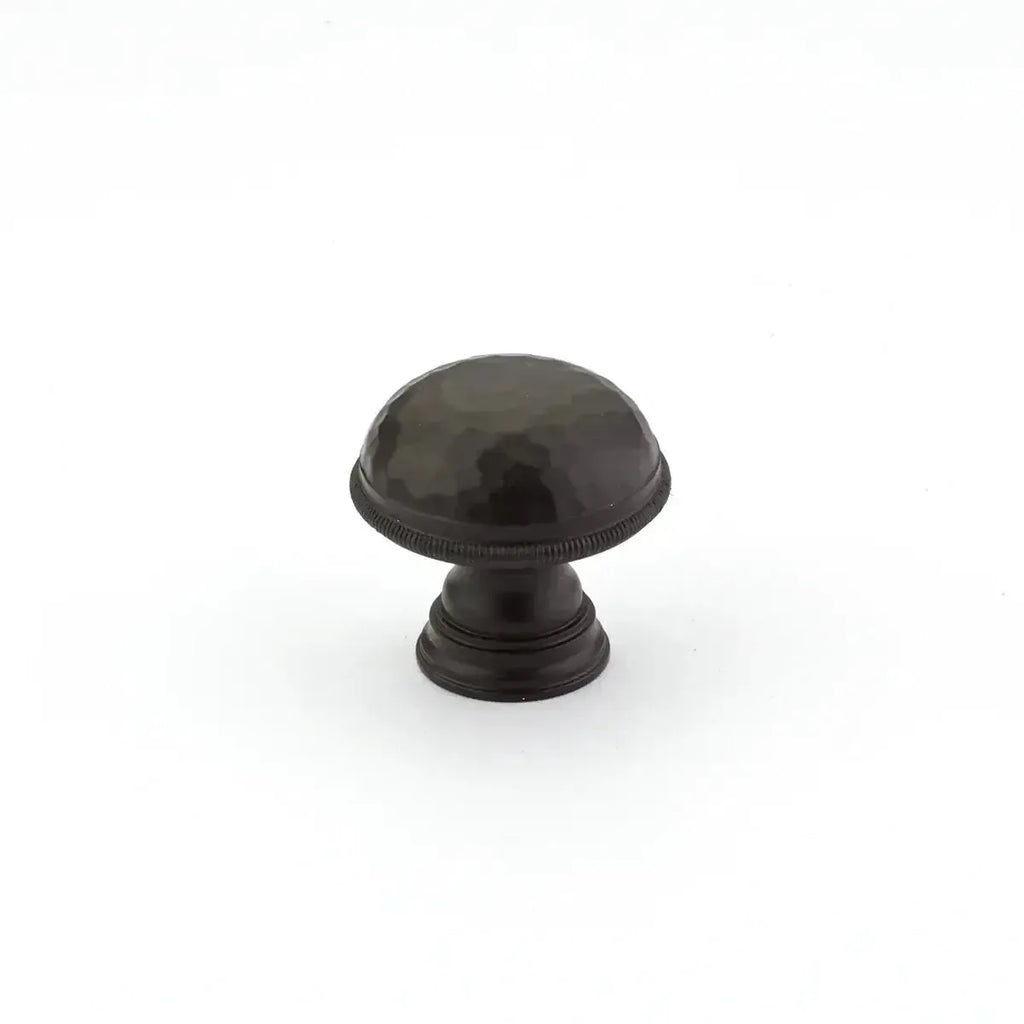Featuring a hammered face surrounded by a finely knurled edge, this knob combines rustic charm with a modern industrial touch.