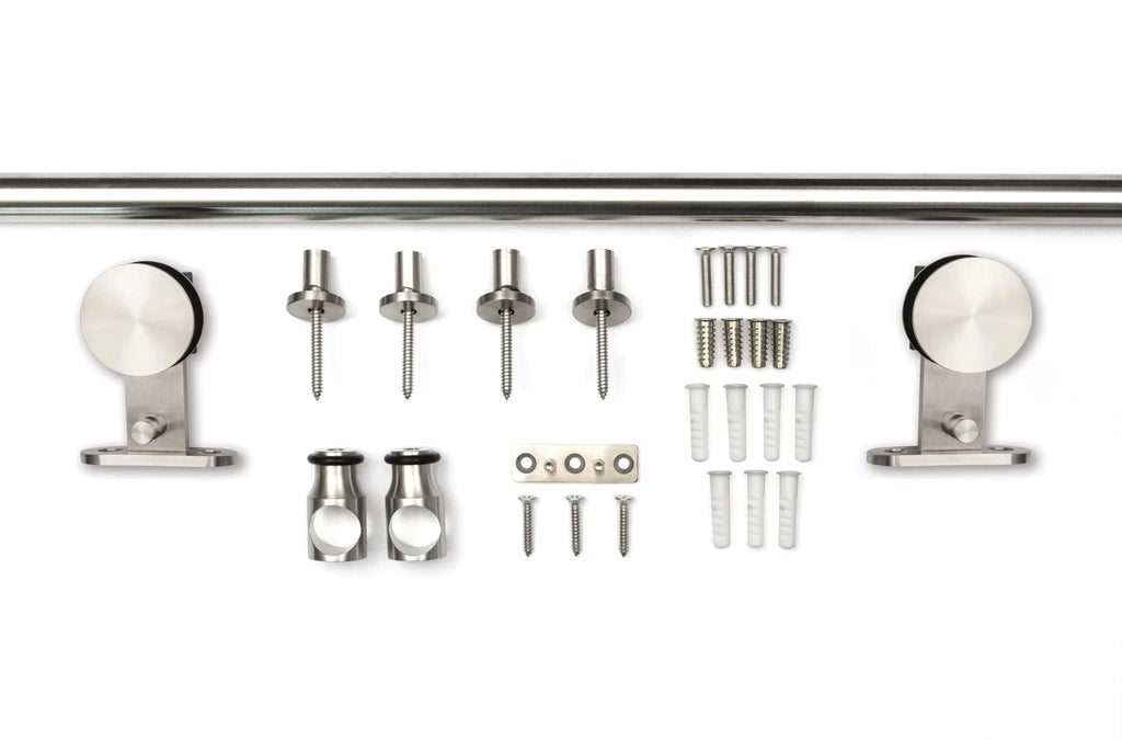The Stainless Steel Barn Door Rail System provides a modern approach to traditional barn door hardware. By being able to divide your living space in creative ways, Barn Doors enable a more efficient use of space. This rail system expresses a beautiful, minimalistic look, while allowing your door to slide smoothly and quietly. Favorable applications include closet or pantry door, door or window covering, decorative wall accent, or room divider.