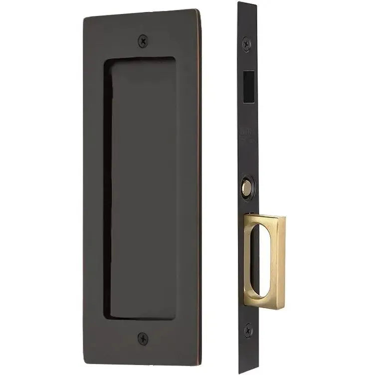 A solid lock body mortise box, with a push button finger pull in the trim, this item is offered in keyed, privacy, passage or dummy applications. The Modern Rectangular Pocket Door Mortise Locks offers a clean, contemporary trim style and high-quality lock for your sliding interior doors.