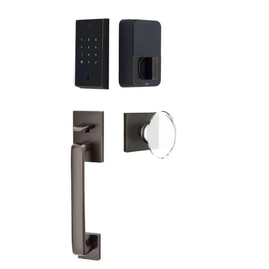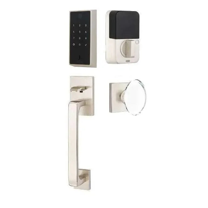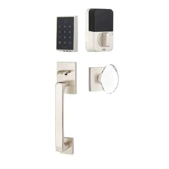 Immerse yourself in the fusion of modern technology and timeless elegance with the Emtek EMPowered 2. This set pairs the minimalist Baden grip exterior with the classic Hampton glass knob interior, creating a stunning contrast. Enjoy keyless entry via touchscreen or smartphone app, managing access and monitoring activity effortlessly. The Hampton glass knob adds a touch of refined sophistication, while the Baden grip maintains a clean, contemporary profile. This combination ensures your entryway is both secure and visually captivating.