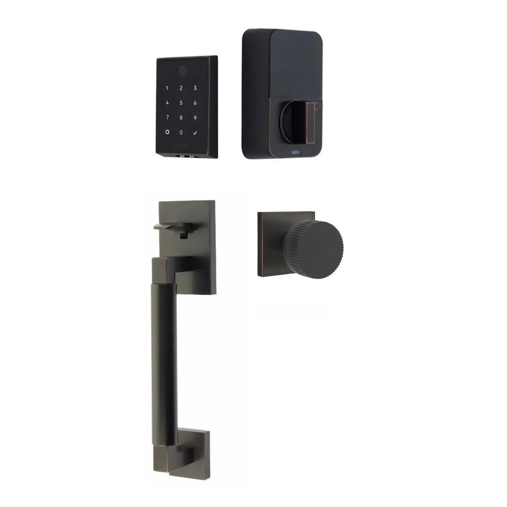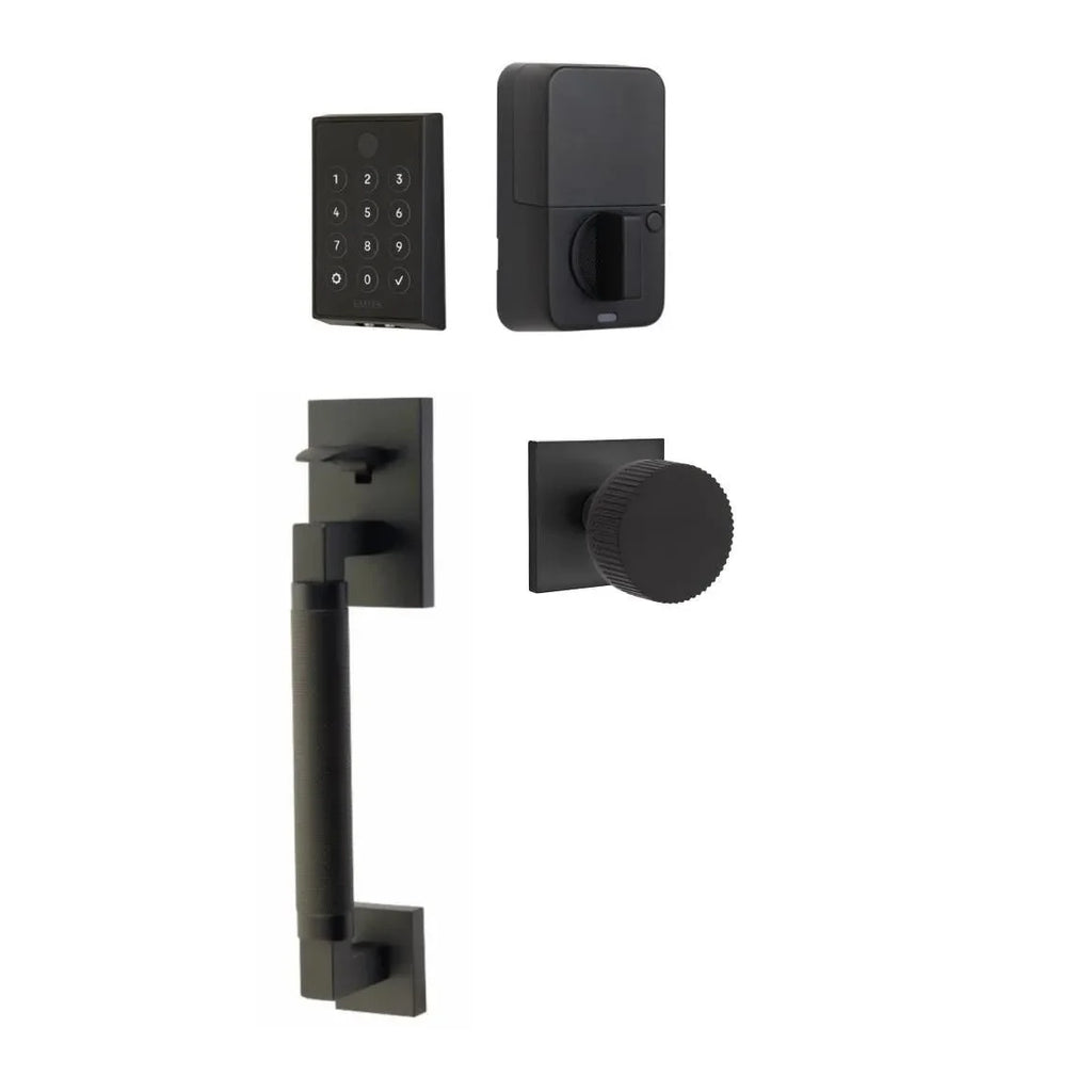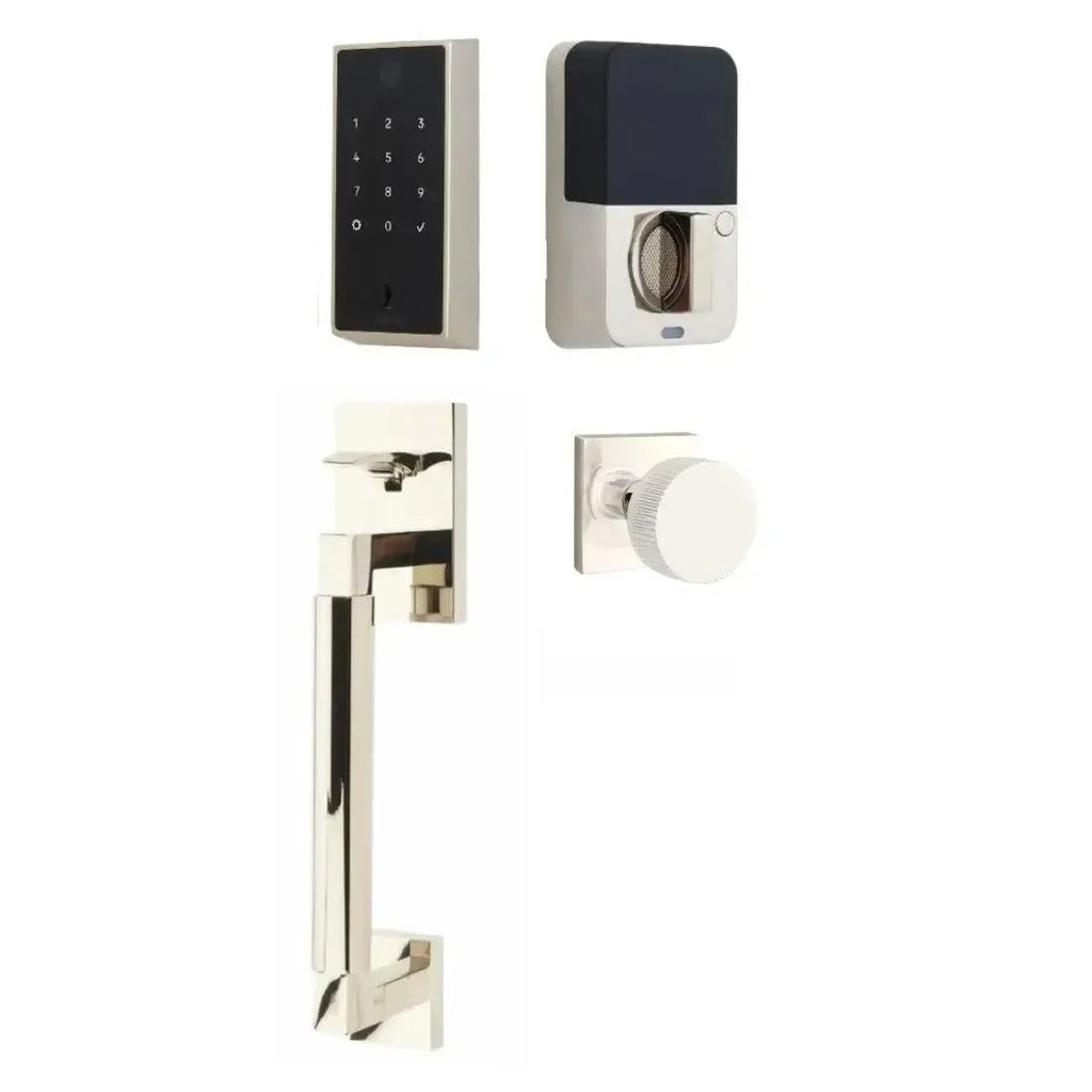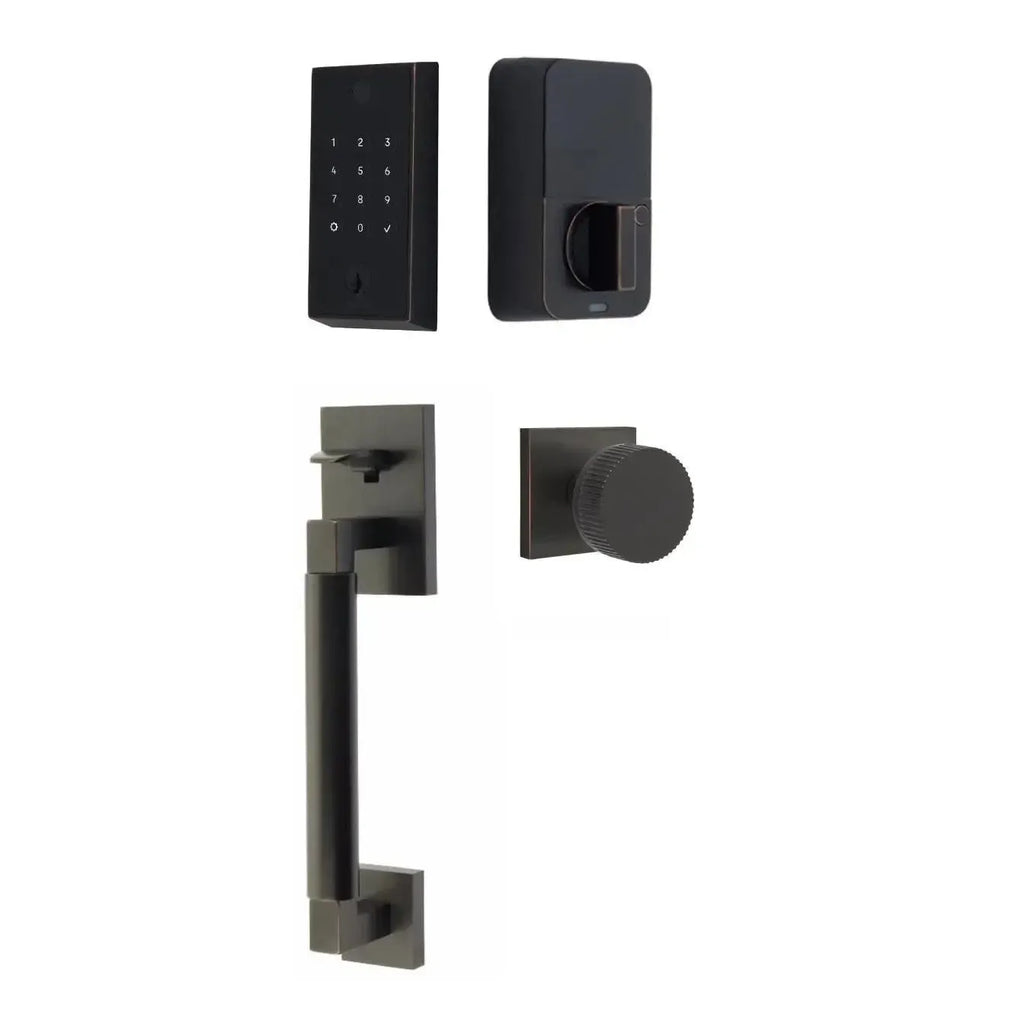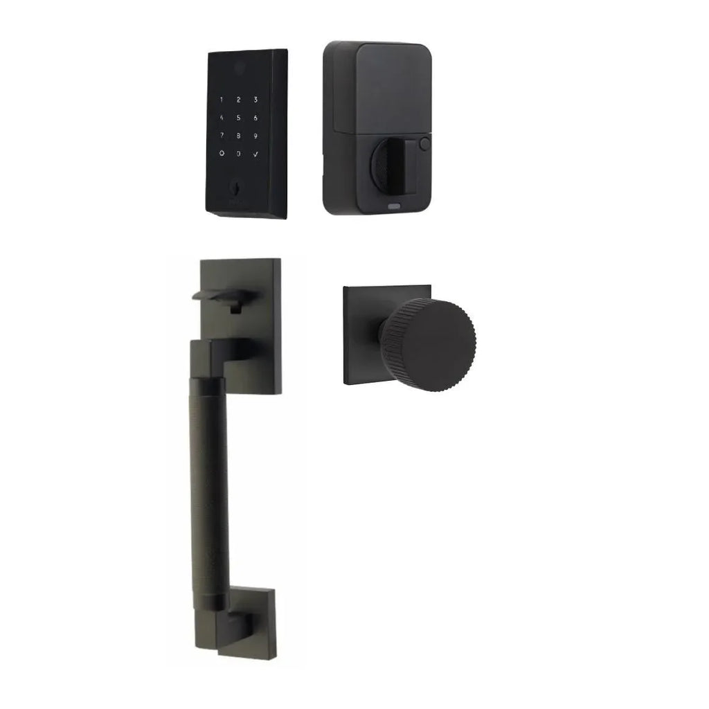 Modern security meets tactile elegance with the Emtek EMPowered 2. This key-free entry set features a touchscreen keypad and Bluetooth connectivity for seamless access control via your smartphone. The Hercules knurled grip offers a secure and textured handhold, adding a touch of industrial chic to your entryway. Inside, a conical straight knurled knob provides a contemporary complement. Emtek's renowned craftsmanship ensures both lasting beauty and robust security.