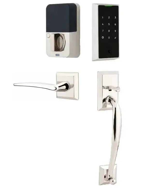 The Emtek EMPowered 2 Touch Entry Set with Franklin Grip and Poseidon Lever provides a sophisticated smart lock experience by merging classic aesthetics with advanced technology. This premium set features the transitional Franklin Grip exterior paired with a sleek touchscreen keypad and the interior's elegant, contemporary Poseidon Lever. A key feature is the new biometric fingerprint access, which unlocks the door with 99% accuracy in less than half a second, offering the fastest and most secure keyless entry. The system includes integrated Bluetooth with Auto-Lock and key code management, while an optional Wi-Fi upgrade enables remote control, real-time alerts, and seamless integration with the Yale Access App and voice assistants. Crafted from solid brass, this handleset ensures both robust security and enduring high-end curb appeal.