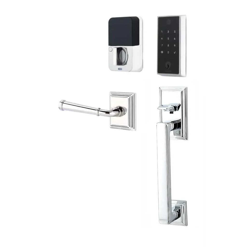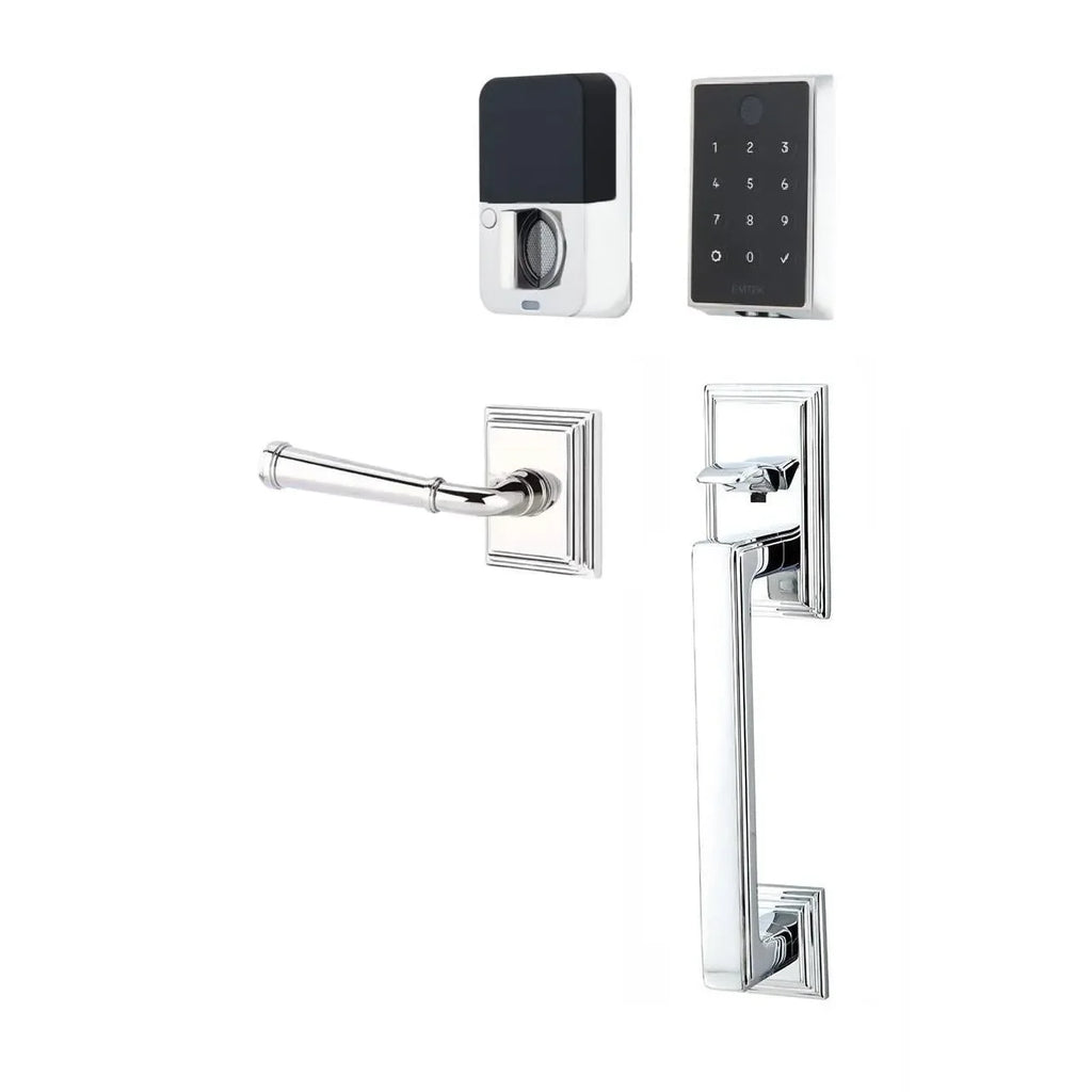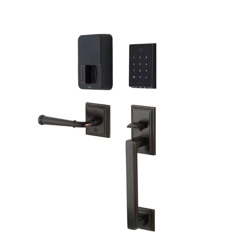 Say goodbye to keys and hello to smart, sophisticated security with the Emtek EMPowered 2. This set offers multiple key-free entry options, including a touchscreen keypad and smartphone app control via Bluetooth. The Hamden Entry Set features framed, stepped backplates. The interior Merrimack Lever with Wilshire Rosette provides a classic complement. Emtek's commitment to quality is evident in the durable construction and elegant finishes. This entry set provides both enhanced security and sophisticated style for your peace of mind, adding a touch of modern elegance to your home.
