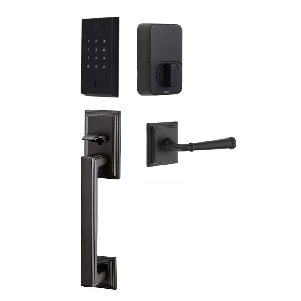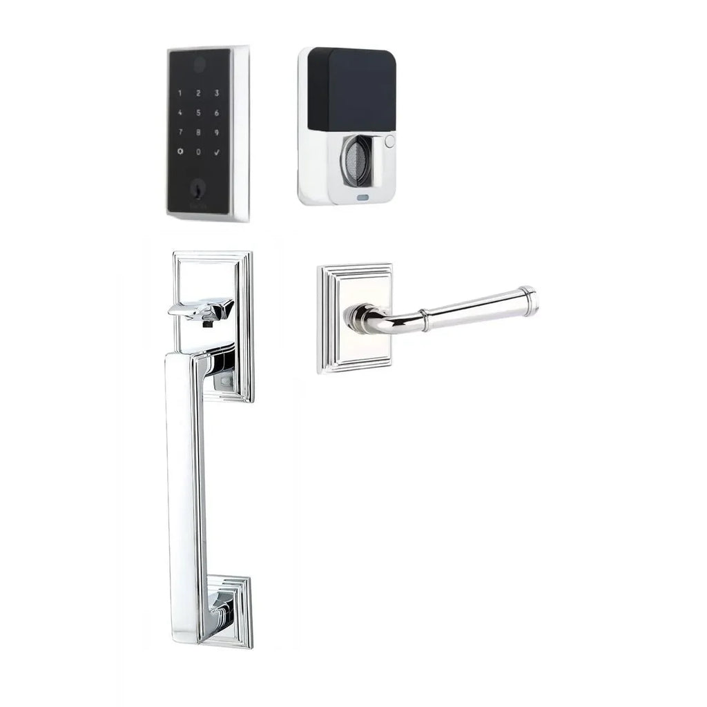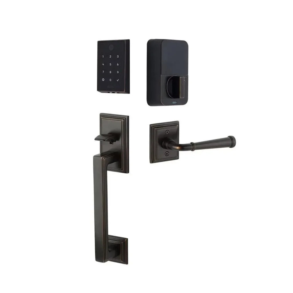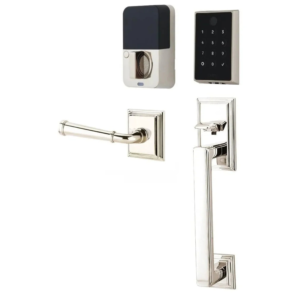Say goodbye to keys and hello to smart, sophisticated security with the Emtek EMPowered 2. This set offers multiple key-free entry options, including a touchscreen keypad and smartphone app control via Bluetooth. The Hamden Entry Set features framed, stepped backplates. The interior Merrimack Lever with Wilshire Rosette provides a classic complement. Emtek's commitment to quality is evident in the durable construction and elegant finishes. This entry set provides both enhanced security and sophisticated style for your peace of mind, adding a touch of modern elegance to your home.