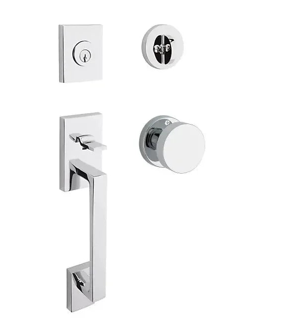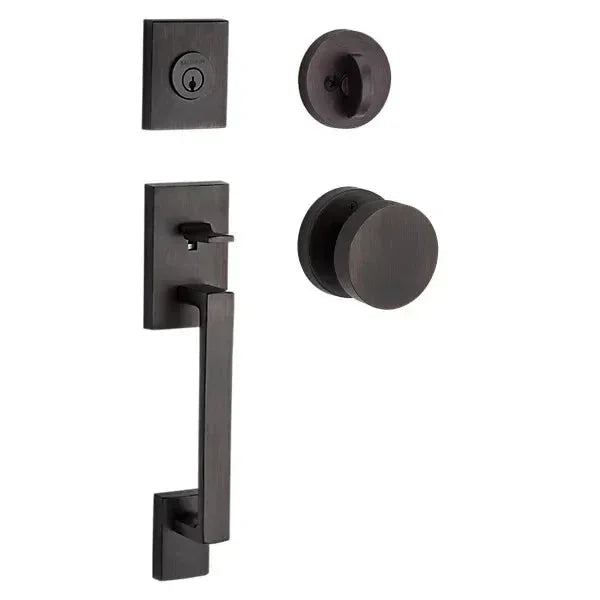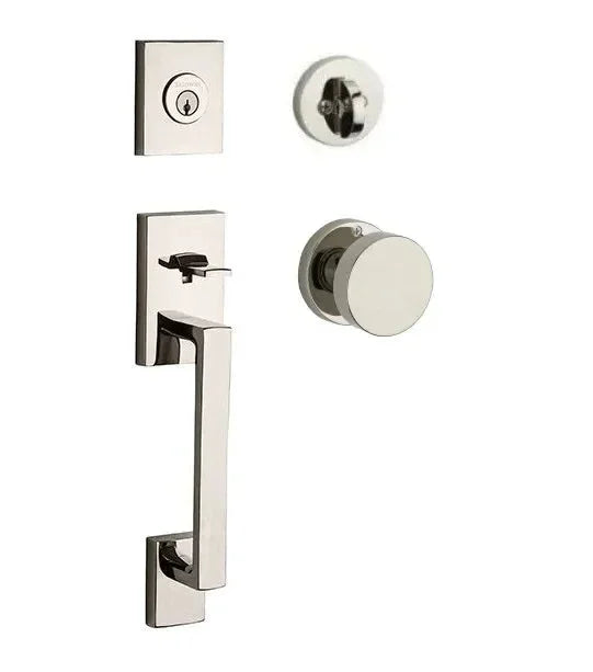Bring sophisticated style to your entry with the Baldwin La Jolla Handleset. This hardware features a contemporary grip and a classic interior knob, all accented by a sleek, round rosette. It's crafted from solid forged brass for unmatched durability and a luxurious feel, making it the perfect statement piece for a modern home.