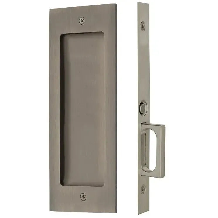 A solid lock body mortise box, with a push button finger pull in the trim, this item is offered in keyed, privacy, passage or dummy applications. The Modern Rectangular Pocket Door Mortise Locks offers a clean, contemporary trim style and high-quality lock for your sliding interior doors.