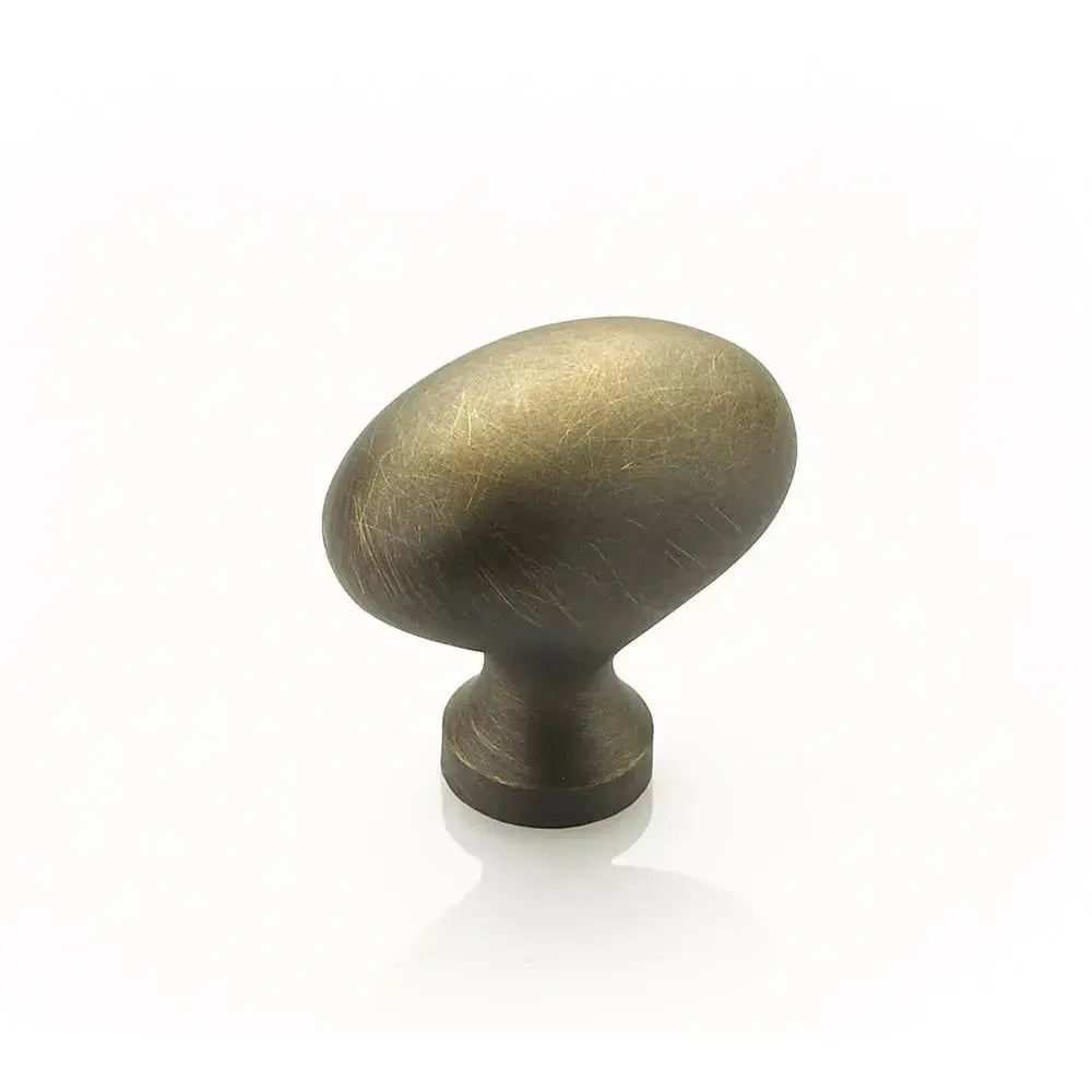 Meticulously formed from high-grade solid brass, this cabinet knob features an elongated oval shape that offers a unique alternative to traditional round hardware. It is part of an expansive heritage collection, available in multiple sizes and a curated selection of premium finishes designed to age gracefully. The substantial weight and smooth, ergonomic surface provide a high-end tactile experience that enhances the architectural character of any kitchen or bath.