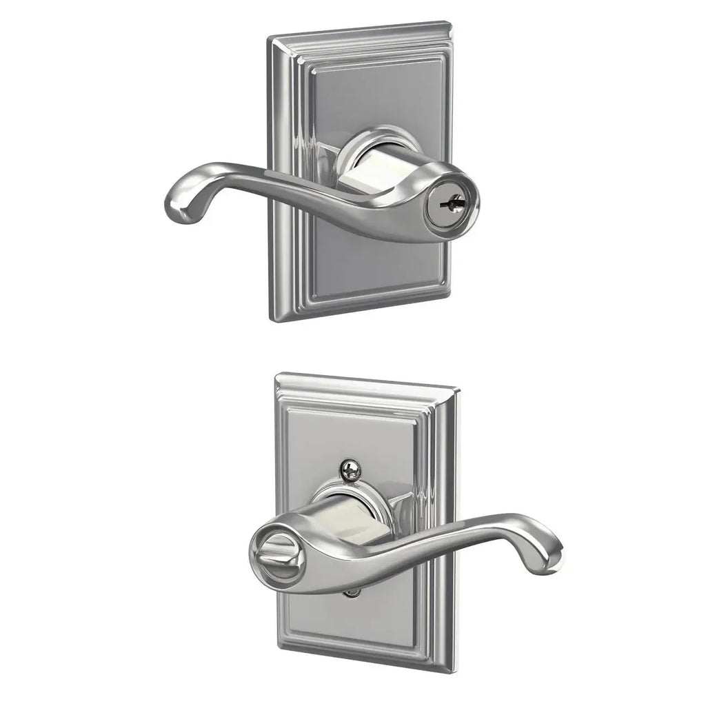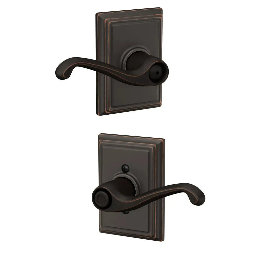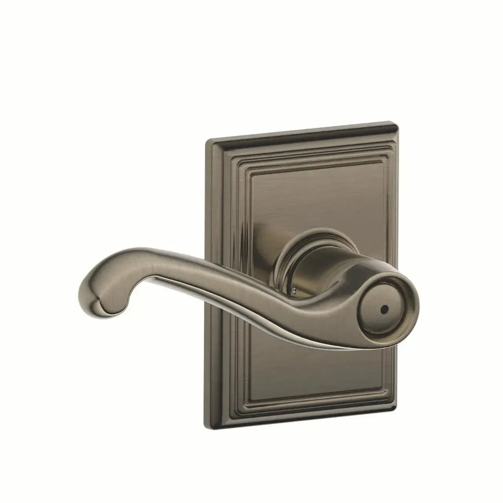 The Schlage Flair Lever with Addison Rosette balances curved elegance with geometric structure for refined interior door applications. The sweeping lines of the Flair lever contrast beautifully against the Addison rosette's clean borders, creating sophisticated visual harmony. Schlage's engineering ensures dependable daily performance across bedrooms, bathrooms, and interior spaces.