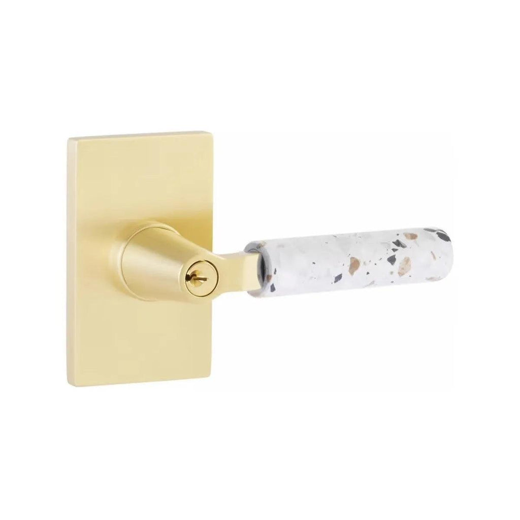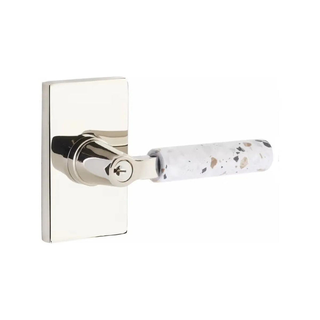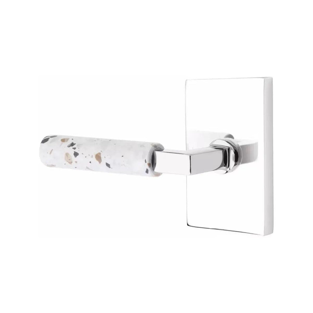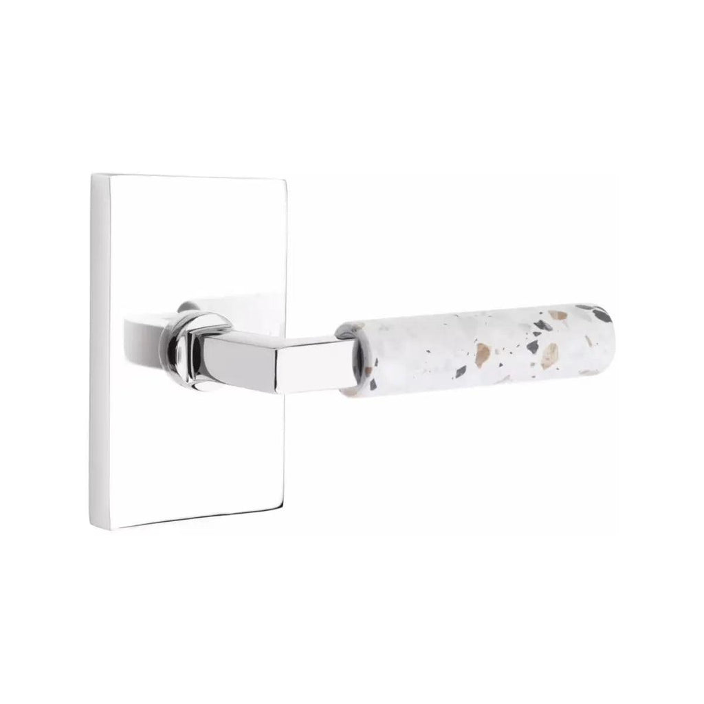 The Emtek Select L-Square Terrazzo Lever with Modern Rectangular Rosette combines bold geometric design with the unique character of terrazzo stone. Its clean rectangular base adds a contemporary edge that pairs seamlessly with modern interiors. Built with lasting durability, this lever offers both strength and sophistication. Perfect for homeowners and designers who want door hardware that makes a stylish statement.