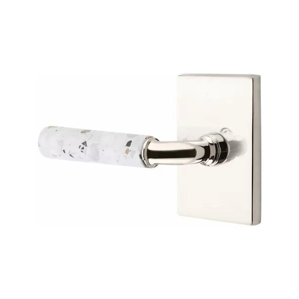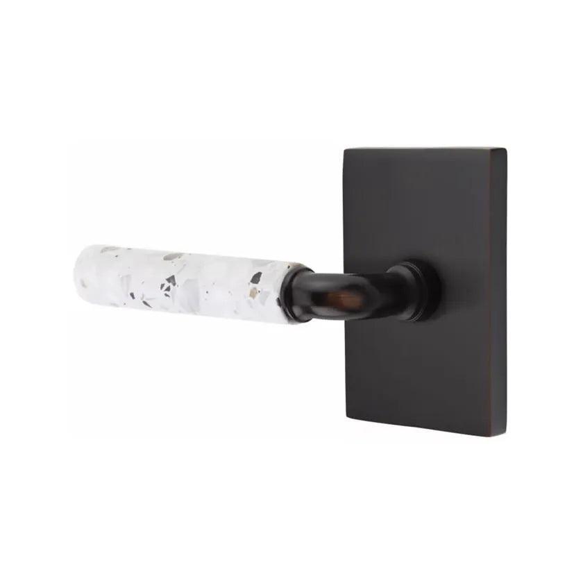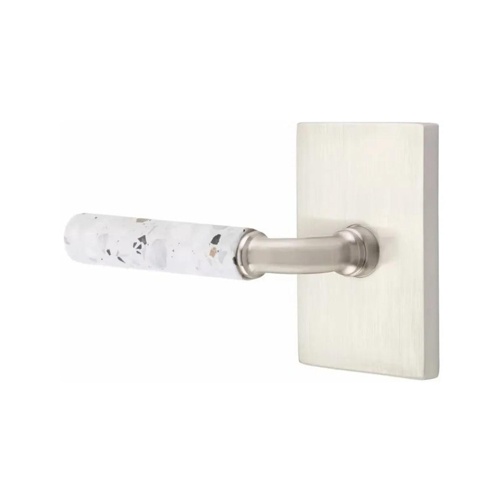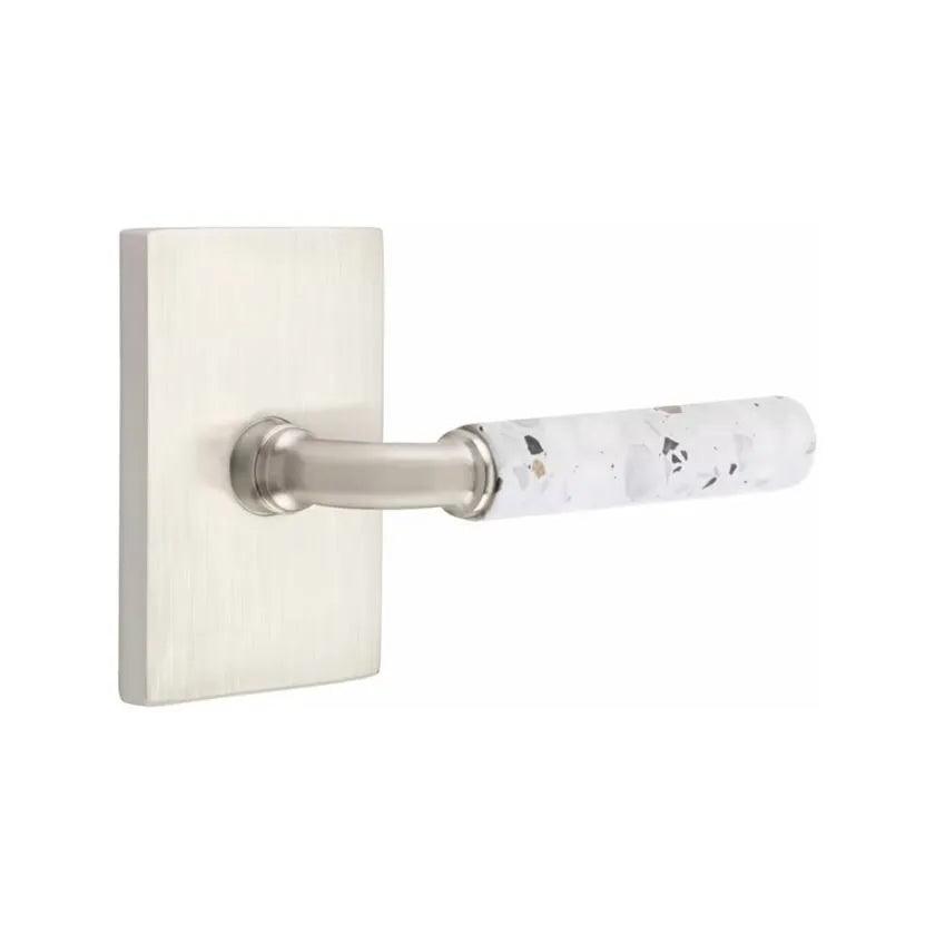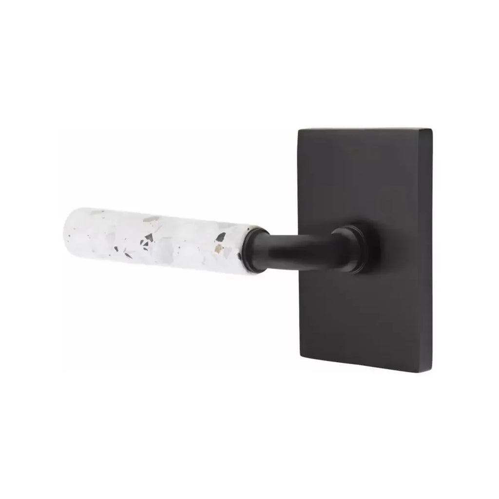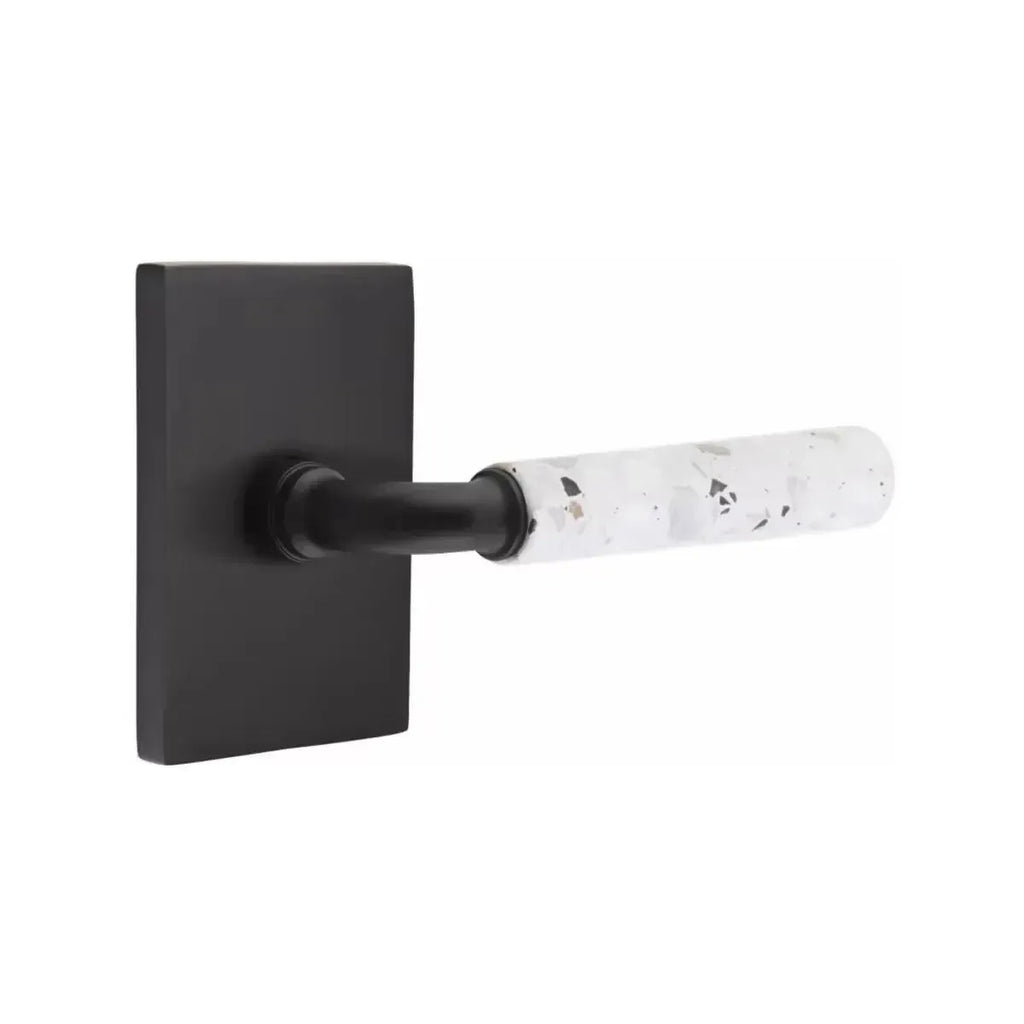 Sleek lines and natural texture bring a sophisticated edge to this lever design. The Emtek Select R-Bar Terrazzo Lever with Modern Rectangular Rosette pairs the unique character of terrazzo stone with a clean rectangular base for a bold modern look. Built for durability, it offers lasting performance with high-end style. A perfect choice for homeowners and designers seeking hardware that blends contemporary form with natural elegance.
