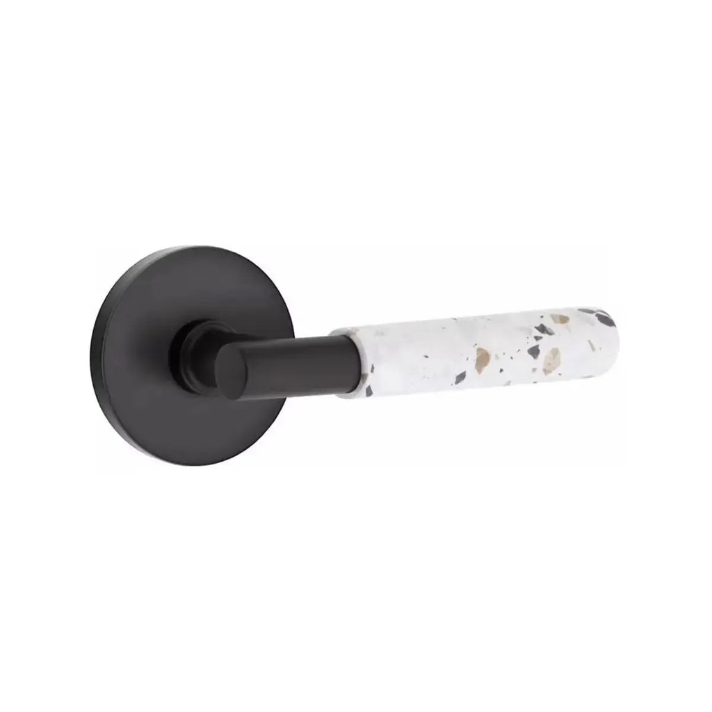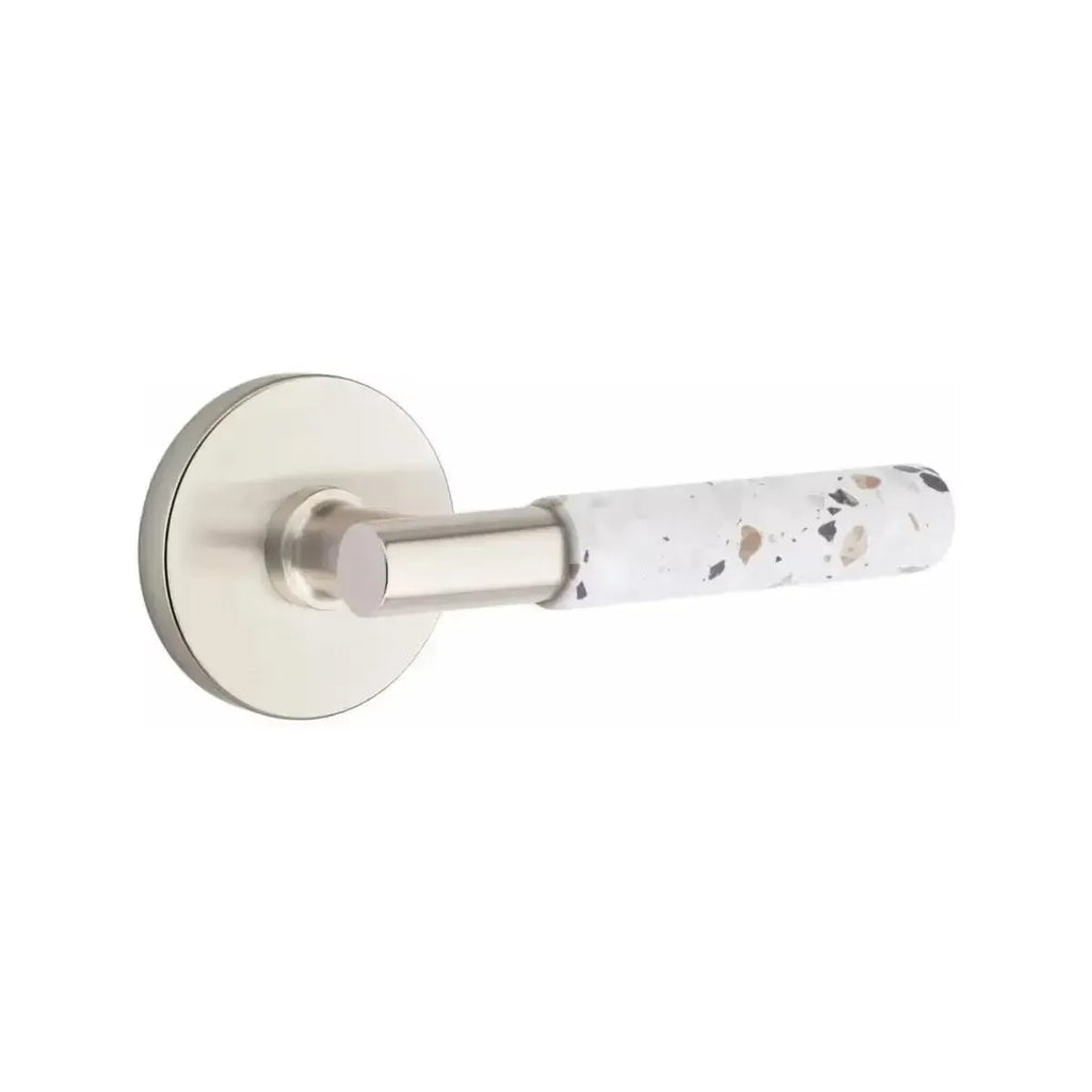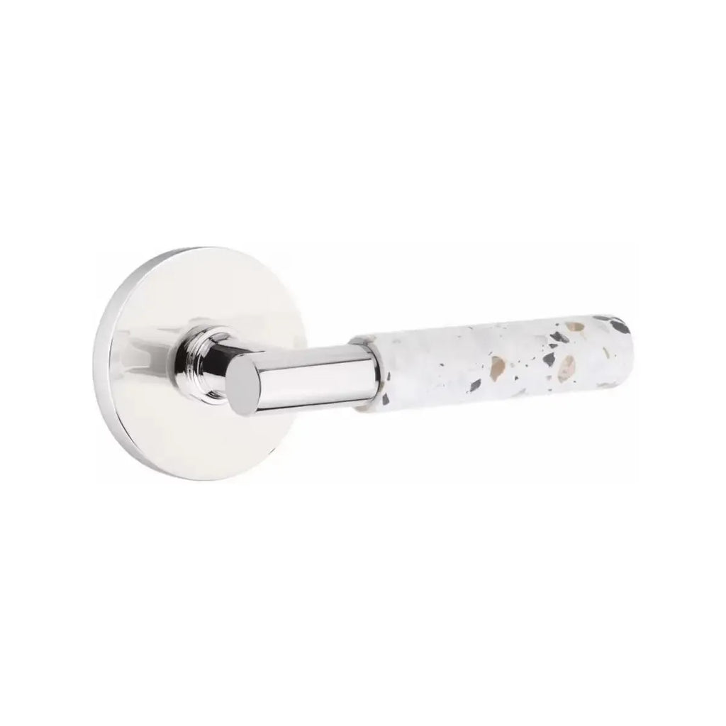 The Emtek Select T-Bar Terrazzo Lever with Disk Rosette combines modern simplicity with the unique character of terrazzo stone. Its circular rosette softens the bold T-Bar design, creating a balanced look that works beautifully in contemporary spaces. Built for durability, this lever offers both style and strength. A perfect choice for homeowners and designers who want door hardware with texture and sophistication.