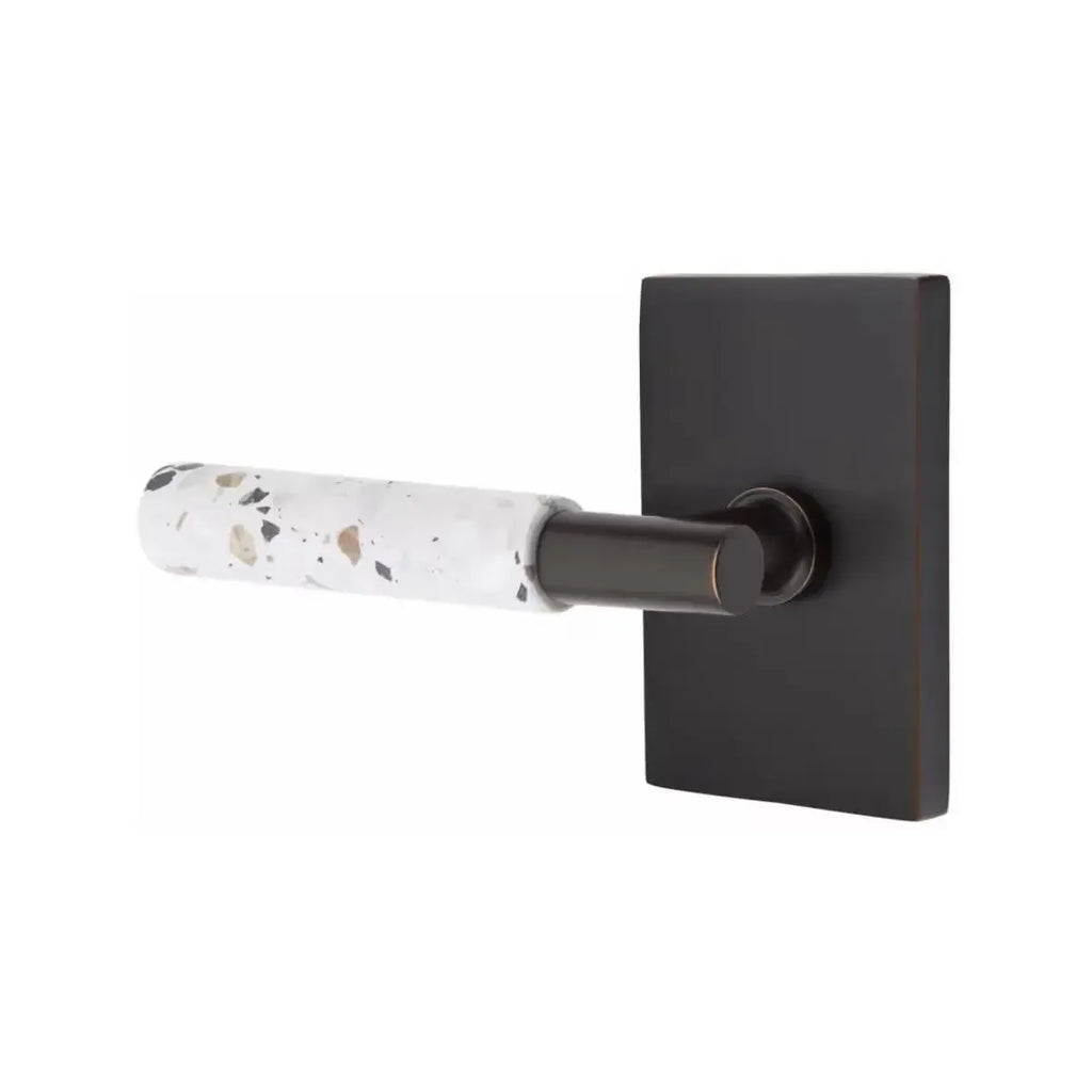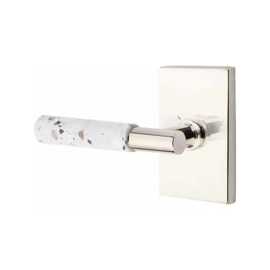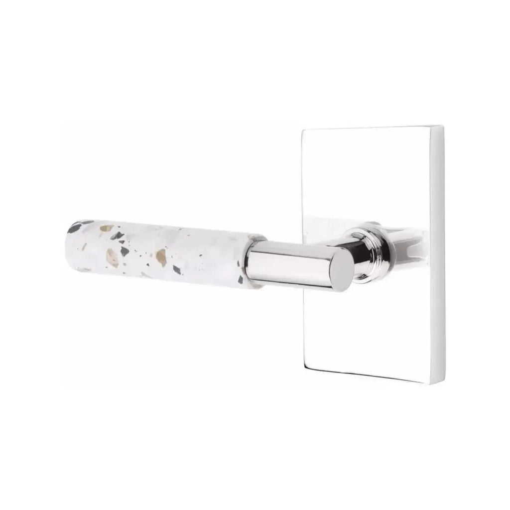 The Emtek Select T-Bar Terrazzo Lever with Modern Rectangular Rosette showcases a sleek, contemporary design accented by terrazzo stone. Its clean rectangular rosette enhances the modern profile, making it a perfect fit for stylish interiors. Crafted for durability, this lever blends natural texture with lasting performance. A standout choice for homeowners and designers seeking a refined yet distinctive look.